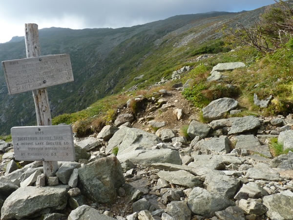The signpost is at the junction of the Tuckerman Ravine and Alpine Garden trails. The lower board gives the distances down to Pinkham Notch and up to the summit of Mt Washington as 3.4 miles (5.5 kms) and 0.8 miles (1.3 kms) respectively. I reached the junction at 8:50 am – i.e., it had taken me slightly less than three hours to climb the 3.4 miles from Pinkham Notch. Although this photo looks south across the top of the Tuckerman Ravine headwall … |