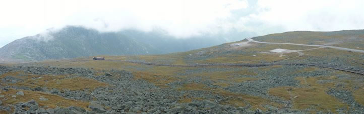 A two-shot panorama looking north from near the summit of Mt Washington. The final portion of the cog railway can be seen in the middle distance, and part of the Mt Washington Auto Road is visible behind it.