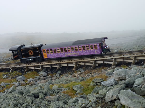 A cog railway engine and carriage making their way up the final incline below the summit of Mt Washington. No doubt the train was saying, “I think I can, I think I can, I think I can …”