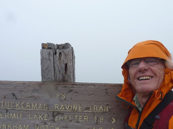 … and it began to rain. I changed into wet-weather gear and, at 11:05 am, I took this self-portrait – a “selfie” – prior to heading down the Tuckerman Ravine trail.