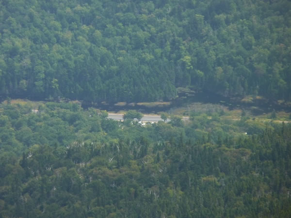 A telephoto picture looking down at New Hampshire state highway 16 and cars parked near Pinkham Notch.