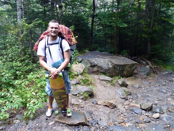At 2:15 pm, we met this young Latvian man heading up the mountain wearing cheap sneakers and carrying a long skateboard and a 66 lb / 30 kg pack! Rather him than me …