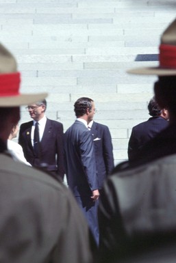 Talking of national leaders, it's at this point that I should admit that the King of Sweden persuaded me to make a radical break with respect to the camera equipment I used. Unlike the Princess of Wales, though, he didn't speak to me personally. Far from it: he came to New Zealand in 1989 and I went to photograph him as he reviewed an honour-guard of troops on Parliament Building's forecourt. I took along my Olympus single lens reflex camera and a 75-150 mm telephoto lens and stood behind the crowd-control barriers (not that the crowds were either large or needed controlling). However, King Carl XVI Gustav moved so rapidly along the lines of soldiers he had to inspect that I could almost never get him in focus in the viewfinder of my camera. The pictures I took of him were pathetic.