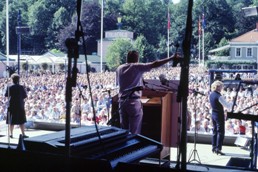 Nine years later, I attended a Social Democratic party election rally in Göteborg (i.e., Gothenburg) in Sweden. As I inched my way forward – taking photographs as I did – getting closer and closer to the platform where Prime Minister Olof Palme was talking, a white-coated official stopped me and asked me what I was doing. After I told him, he exclaimed, "Ah New Zealand! Go up onto the platform." I duly did so, and as a result was one of only four people on the covered stage looking out across the large crowd that had assembled in the grounds of the Göteborg's Liseberg amusement park to hear the Swedish Prime Minister speak. The other three people were the two deaf translators and Olof Palme himself – showing both just how easy it was to get close enough to Olof Palme to take some really good photographs and yet, at the same time, just how vulnerable the Swedish Prime Minister really was. Five months later Olof Palme was assassinated in the streets of Stockholm as he walked home from the cinema with his wife.