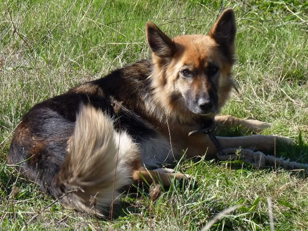 This well-groomed German Shepherd was constrained by a thick rope.
