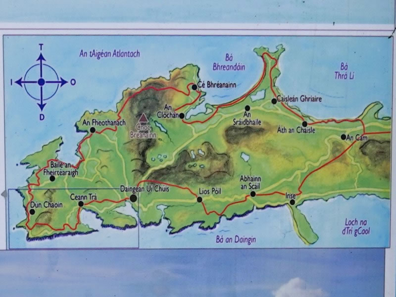 The Dingle Way is shown in red on this map of the Dingle Peninsula. Heather and I walked clockwise round the peninsula, starting and ending in Dingle – or, as it’s labelled on this map,