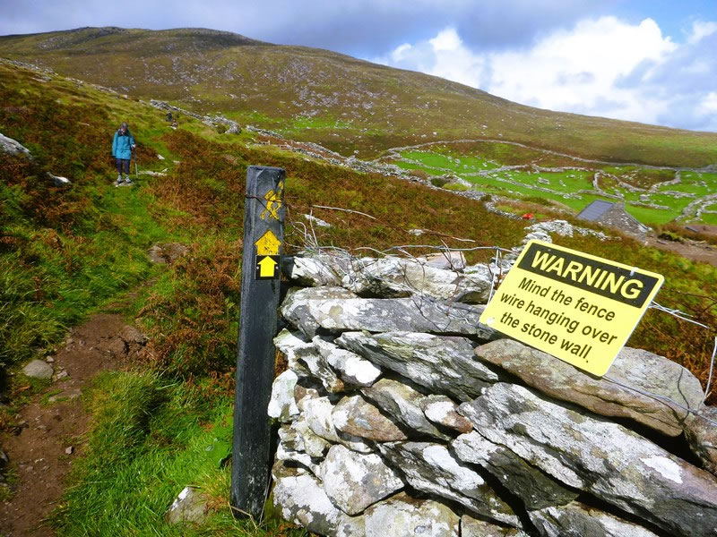 Day 1 (Thursday, 4 September 2025) – Dingle (Daingean Ui Chuis) to Dunquin (Dun Chaoin): Unlike England and Wales, public paths in Ireland don’t often go cross private property, so – for the most part – we walked above farms and paddocks delineated by stone walls on the slopes of Mount Eagle. |