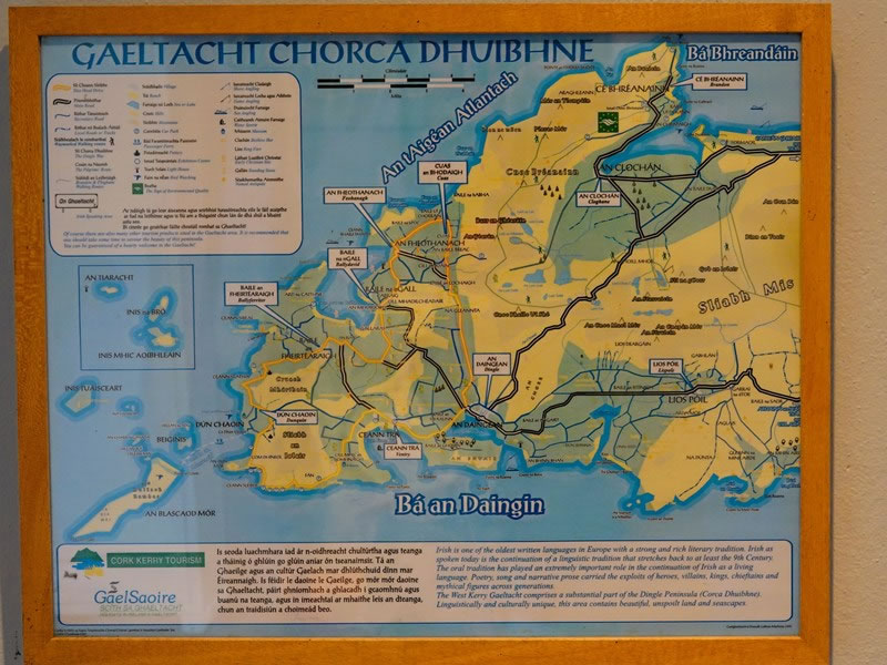 Day 2 (Friday, 5 September 2025) – Dunquin (Dun Chaoin) to Cuas (An Chlais): While were in the An Bothar pub, I took this photograph of a map of the Dingle Peninsula, and a part of the caption beneath the map is worth quoting: “Irish is one of the oldest written languages in Europe with a strong and rich literary tradition. Irish as spoken today is the continuation of a linguistic tradition that stretches back to at least the 9th Century. The oral tradition has played an extremely important role in the continuation of Irish as a living language. Poetry, song and narrative prose carried the exploits of heroes, villains, chieftains and mythical figures across generations.” |