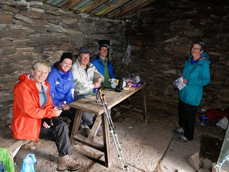 Day 3 (Saturday, 6 September 2025) – Cuas (An Chlais) to Cloghane (An Clochan): Just as we were finishing our lunch, a family of four from Belgium arrived at the hut, so they took our place at the table and I took this photograph of them and Heather. They were the only people we met who were walking anti-clockwise round the Dingle Peninsula. Everyone else, like ourselves, was going clockwise. |