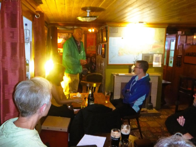 Day 3 (Saturday, 6 September 2025) – Cuas (An Chlais) to Cloghane (An Clochan): Micheal O’Dowd welcoming all his customers on a wet Saturday night and regaling everyone with accounts of historical air crashes on Mount Brandon (including the Second World War accident involving six members of the Polish air force that we’d read about earlier in the day). |