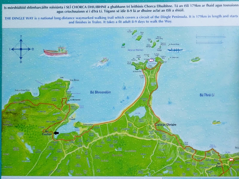 Day 4 (Sunday, 7 September 2025) – Cloghane (An Clochan) to Scraggane Pier: … the route that the Dingle Way follows on the northern side of the Dingle Peninsula. Our fourth day’s walk took us from the point of the black arrow that I’ve added to the picture alongside Cloghane’s Irish name (viz., An Clochan) through to the point of the white arrow fringed with purple that’s near the top of the narrow peninsula in the middle of the picture. Our fifth day’s walk began where our fourth day’s walk had ended, and it finished at the point of the white arrow fringed in red in the bottom right-hand corner of the picture. |