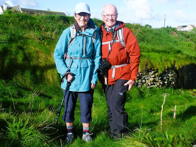 Day 5 (Monday, 8 September 2025) – Scraggane Pier to Camp (An Cam): We left Harbour House at 9:05 am. We crossed the road and I put my small water-proof camera on a wall and took this picture of Heather and me before we set off on our fifth day’s walk. |