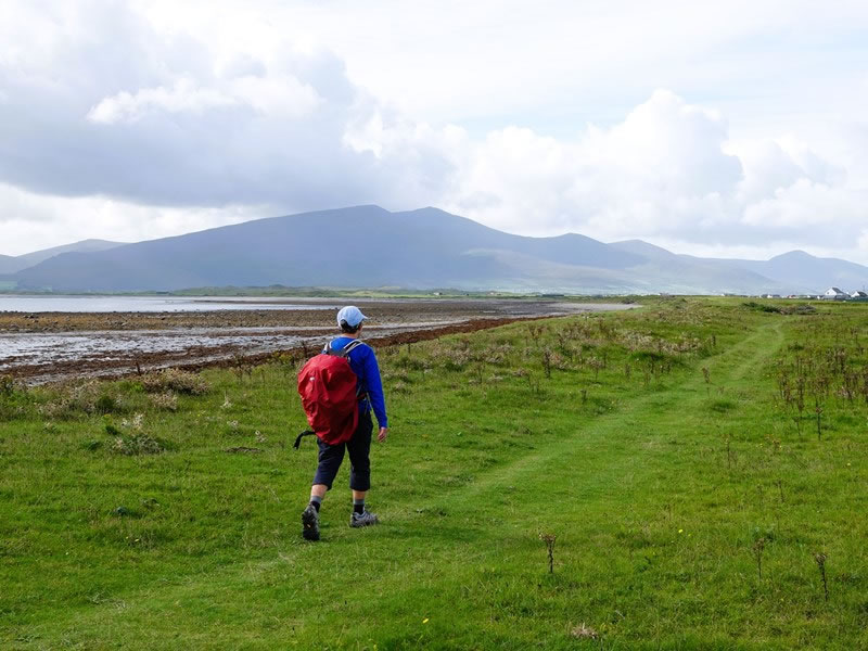 … we walked along the grassy fields beside the rock-strewn beaches on the western edge of Tralee Bay.