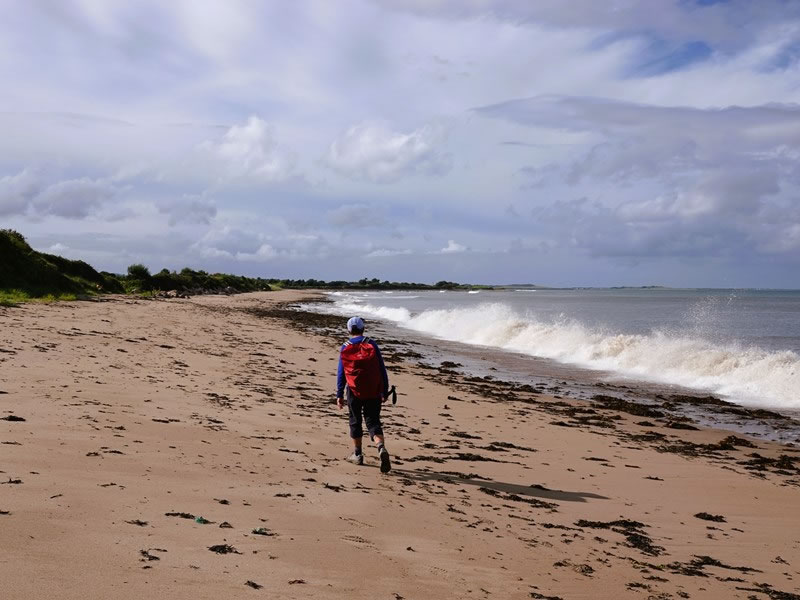 Day 5 (Monday, 8 September 2025) – Scraggane Pier to Camp (An Cam): The sea is on our right in this photograph because 20 minutes after we’d set out along the beach, we had to turn round and find a way off it. Our Hillwalk trip notes had warned us that “on very rare occasions, the route at the foot of the cliffs can be cut off by high tides.” Sadly, this was one of those occasions (indeed, the height of the tide was exacerbated by the fact that it was 8 September – the very day that there was a full moon). |