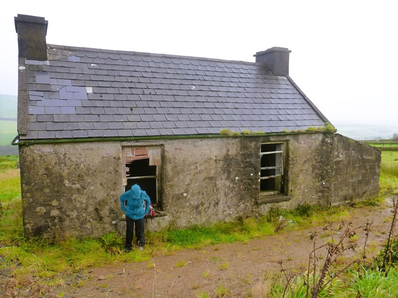 It began to pour, so we hurriedly put on our over-trousers while sheltering on the lee side of an old deserted cottage.
