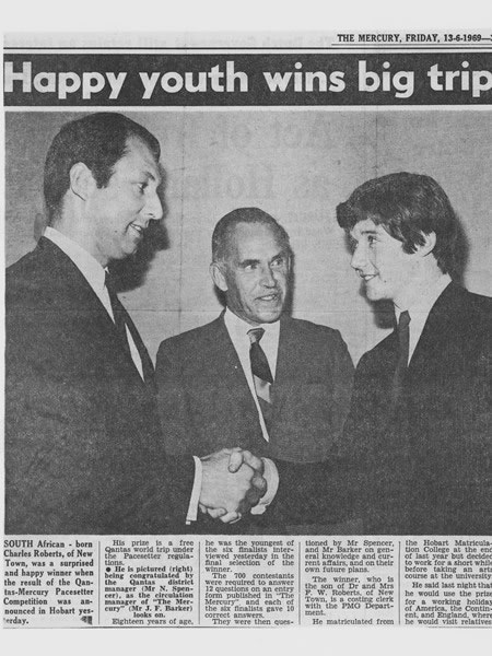 Introduction – UNITED KINGDOM: As this 13 June 1969 clipping from the Hobart Mercury shows, my youngest brother – Charlie (who had turned 18 just one month earlier) – won a round-the-world Qantas airline ticket, and (as the Mercury article noted) he planned to use the prize to enable him to go to “America, the Continent, and England, where he would visit relatives.” His relatives in England, of course, included Heather and me, and we asked Charlie if he’d like to join us on our car trip around Europe. Not only did I feel a sense of responsibility for my baby brother, but I also knew that Charlie’s share of our joint petrol costs could extend the range of sightseeing possibilities for all three of us. |