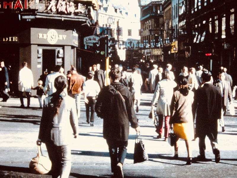 Day 20 (4 October 1969) – COPENHAGEN: We spent the day seeing some of the sights in central Copenhagen. Charlie took this photo of Heather (on the left, wearing a grey suit and carrying a ball-shaped woven basket) and me (alongside Heather and wearing a duffle-coat) while we were walking down Strøget – the city’s well-known ‘walking street’, which is one of Europe’s longest car-free pedestrian streets. |