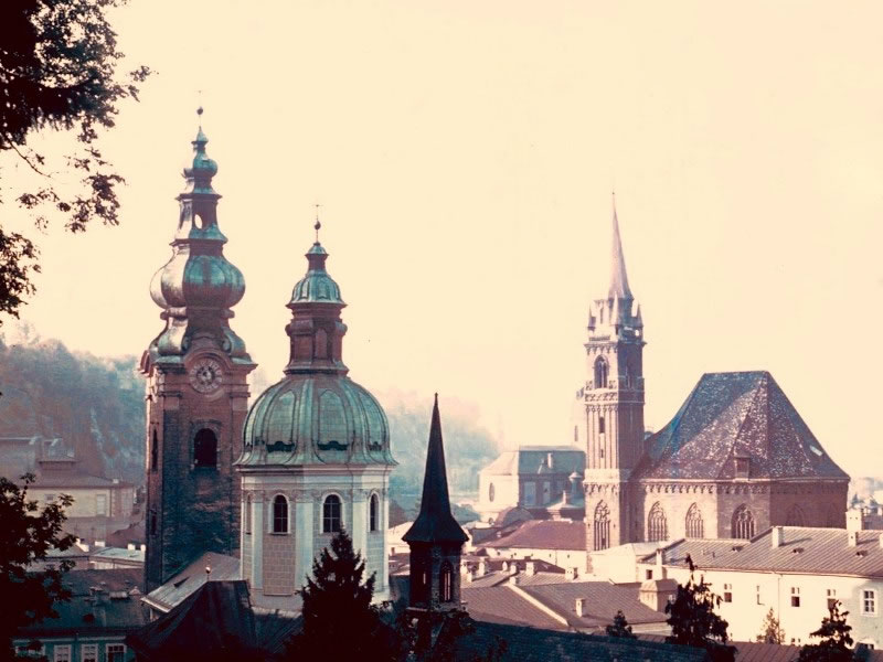 Day 31 (15 October 1969) – SALZBURG: Closer down to street level, I took this photo of the spires of St Peter’s Abbey (on the left) and the Gothic tower and speckled roof of the Franciscan Church (on the right). All in all, we judged Salzburg to be “the most attractive city we’ve seen” so far. |