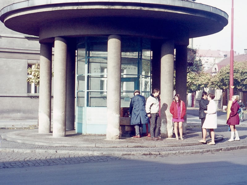 Day 34 (18 October 1969) – PODEBRADY: When we were in Copenhagen, we’d met two Czechoslovakian medical students, Ivan Julis and his fiancée, Dana. They invited us to stay with them in Prague, which is what we did. On our first full day in Czechoslovakia, Heather and I drove Ivan and Dana to Chrudim, a town east of Prague, so that they could visit Ivan’s grandmother. On our way to Chrudim, we stopped to sample mineral water from a spring in Podebrady, a small spa town roughly 60 kilometres east of Prague. This is a photo of Heather (dressed in red in the centre of the picture) and our Czech hosts Ivan (second from the left) and Dana (second from the right) queuing up at the spring. |