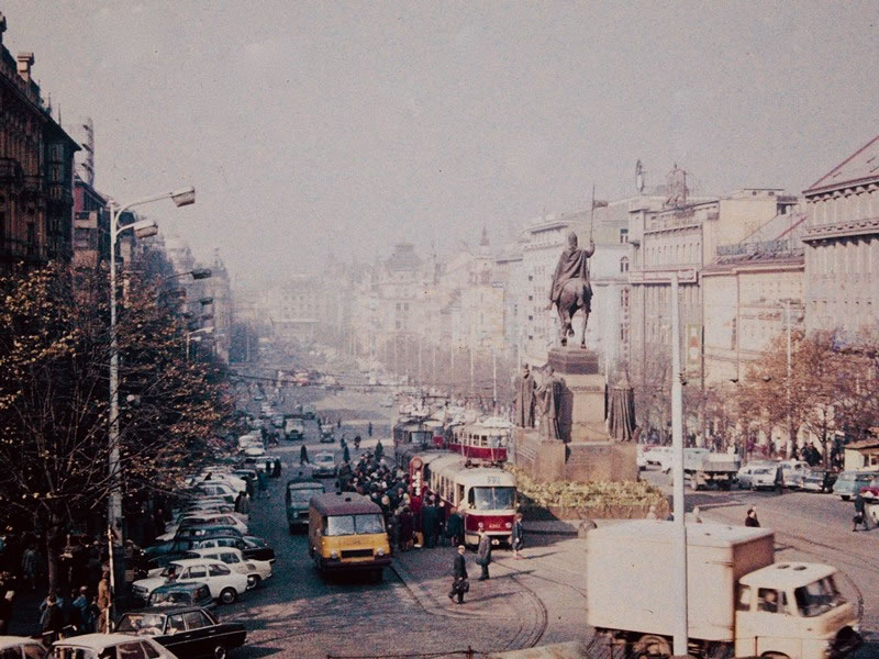 Days 35 to 37 (19 to 21 October 1969) – PRAGUE: Looking down Wenceslas Square, you can see why it has been described as more a boulevard than a square. In August 1968 (14 months before I took this photograph), the square was filled with thousands of demonstrators protesting the Russian invasion of their country and the Soviet Union’s attempt to quash Czechoslovakia’s “Prague Spring.” |