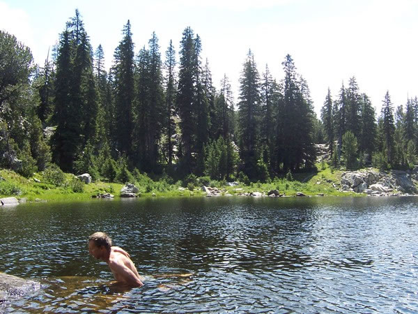 ... before dropping down to Hobbs Lake, where Mark – who seemed to have an in-built resistance to mosquitos – had yet another quick swim.