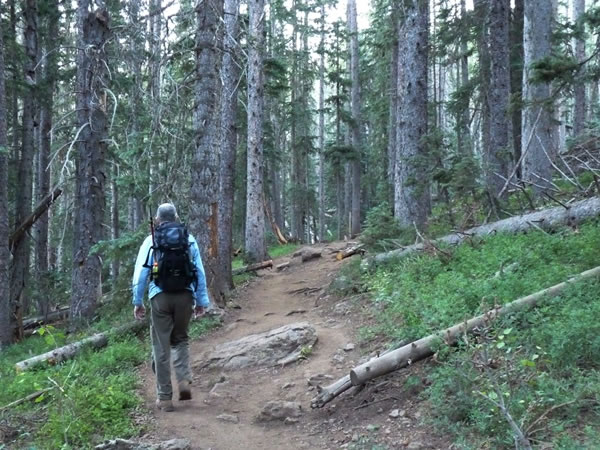While we were heading up the Humphreys Trail, we saw lots of trees like the one Eric is heading towards that had some of their bark torn off. We wondered whether it was done by bears.