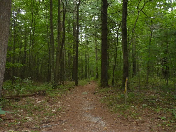 A view of the trail through the woods. In the distance, there’s a tree with two notices on it.