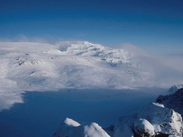 A photo taken from Gillman’s Point looking across Kibo’s crater towards the eastern icefields.