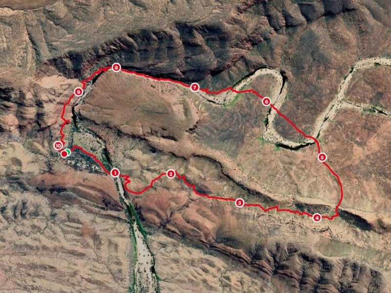 Day 1 (Friday, 28 April 2023) – The Ormiston Pound Walk: I used the MapMyWalk app on my cell phone to track each day’s walk that we did. When I got back to New Zealand, I transferred each day’s data onto my computer and superimposed the GPS-plotted route onto a satellite photograph of the area. This is a vivid illustration of our 28 April hike. It’s so detailed and accurate that you can, for instance, see exactly where we waded through deep water in the gorge (i.e., just past the 8-kilometre mark) and crossed over onto the true right bank of the Ormiston Creek (which is the name of the river that flows through the Ormiston Gorge). |