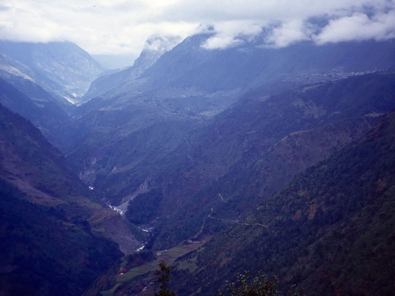 Looking down at the Dudh Kosi river, 1,600 metres or so – about a mile – below us.
