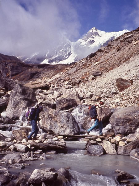 Jon (on the left) and Geoff crossing a glacier-fed stream below the Cho La.