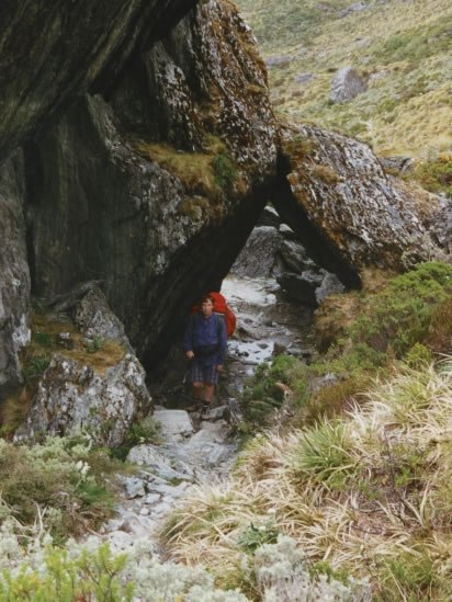 Keith took this picture of Joy coming out from under an impressive rock archway between the Routeburn Falls Hut and the Harris Saddle.