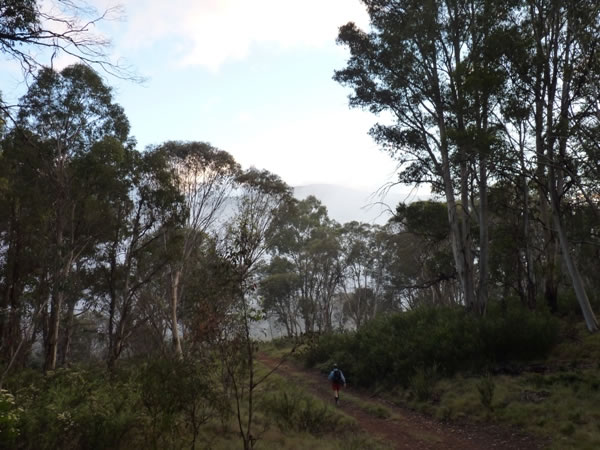 Heading down, after almost 45 minutes' hiking, towards Oldfields Hut, with Bimberi Peak barely visible in the early morning mist ahead of Eric.