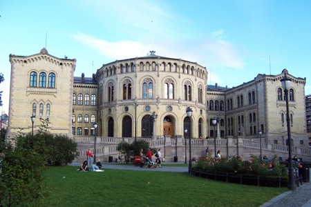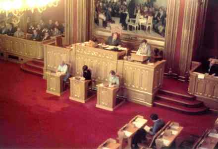 The 169-member Storting in session. The lower half of a large painting of the 1814 Norwegian constitutional convention in Eidsvold is visible behind the Storting President's rostrum.