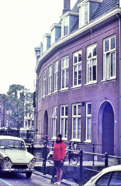 In April 1947, Bobby and Lilian, my older brother Anthony, my younger brother Stuart, and I left London and moved to Utrecht, the fourth largest city in the Netherlands. We lived in Kromme Nieuwegracht 41 for 18 months while Bobby taught anaesthesia to Dutch doctors. I have no memories of the first three years of my life which were spent in England; all my earliest memories stem from the time we lived in Holland. Nineteen years after we left Utrecht, I went back there for the first time and took this photograph of Heather standing in front of the apartments in Kromme Nieuwegracht (which, incidentally, is Dutch for ‘Crooked New-canal’). |
