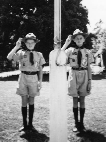 I finished my primary schooling at the end of 1956, and the following year started going to Parktown Boys’ High School. Two Parktown Boys’ friends – Joe Farragher and Keith Norman – were in the same scout troop as me, and the three of us rose through the ranks to become patrol leaders. In December 1958 (at the end of my second and final year at Parktown Boys’ High School), Joe, Keith, and I went on a camping trip to Swaziland, where Joe took this photograph of Keith (on the right) and me saluting after the flag had been raised. |