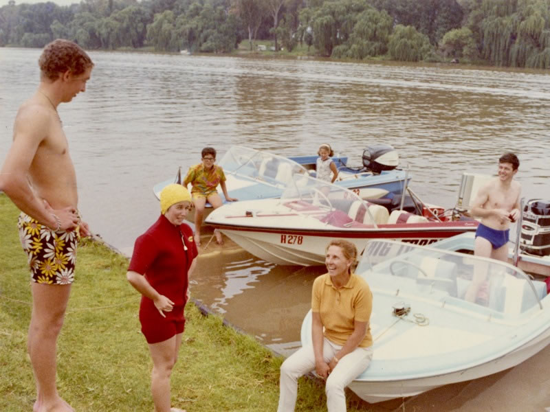 We left England in late 1969 and flew back to the Southern Hemisphere. Our first stop was in South Africa, where this picture was taken. It shows Heather (flanked by Tony and Joan Knight) preparing to water-ski on the Vaal river, and me – with a classic English sun tan – looking at Heather from the back of the boat. |