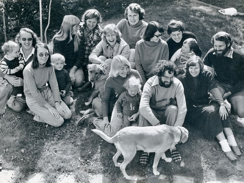 This picture of all the members of the “Creekside” community was taken in early 1976. Keith, Colin, Joy, and Linda McLeod are on the left-hand side of the picture. Martha Pascoe and Dave McArthur are next to the McLeods, and Trish Allen and John Livesey are next to them. Heather is alongside Trish and is looking at Evan (who I’m holding). In the front of the photo are Cynthia, Kamala, and Stuart Payne; and while Sue and Nelson Colyer are the couple on the right-hand edge of the picture. |