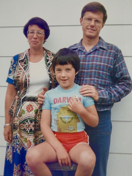 Heather’s mother and my parents visited us in Wellington for the first time in February 1982, which was when this photograph of Heather, Evan, and me was taken in front of our Curtis Street house.