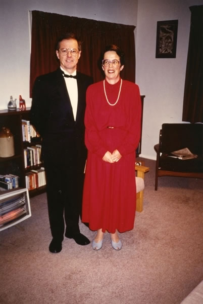 On 16 August 1990, Heather and I were invited to dinner at Government House with the Governor-General Sir Paul Reeves, his wife Beverley, and about a dozen other guests. Before we left home to go the dinner, Evan took this photo of us in our glad rags. |