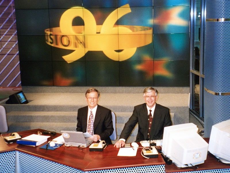 I was an election-night commentator on radio from 1975 till 1984. In 1987, I switched loyalties, moved to television, and then commented for Television New Zealand on election night on eight successive occasions. This picture of Hugh Morton, a Massey University statistician (on the right), and me was taken shortly before the polls closed at 7:00 pm on Saturday, 12 October 1996 – the day that the first general election in New Zealand was held using the mixed member proportional (MMP) representation voting system. |