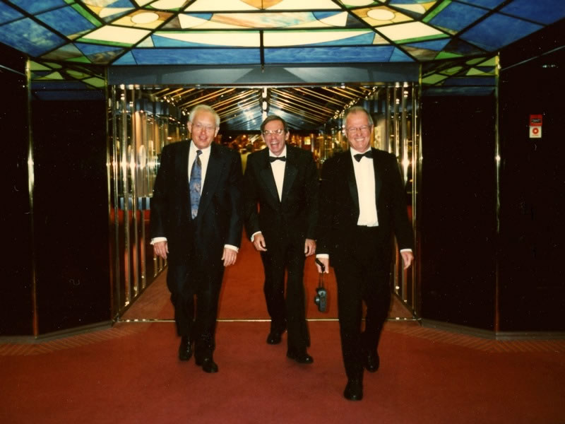 I was very fortunate to be invited to lecture on cruise ships on four occasions, once on a voyage round New Zealand, and three times on voyages in the South Pacific. This is a photograph taken in February 2002 of (from left to right) Jørgen Elklit (a close friend and political science colleague from Denmark), Stephen Levine (a close friend, political science colleague, and co-author of mine at the Victoria University of Wellington), and me while we were on our way to a formal dinner on the Crown Odyssey during my fourth and final cruise ship lecturing 'gig.' |