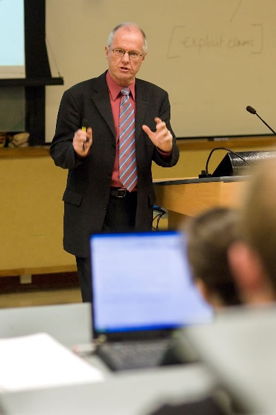 In search of pictures for publicity purposes of university faculty and staff performing a range of activities, a Victoria University of Wellington professional photographer came to one of my POLS 207, Modern American Politics, lectures in the second half of 2007 and took this photograph of me in full flow. |