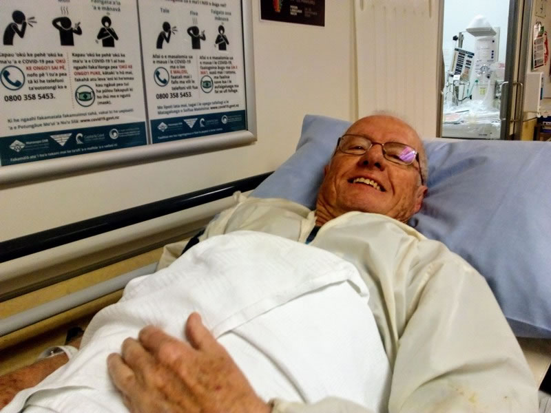 On 10 April 2021, I broke my left femur in a cycling accident. Roughly three hours after my accident, Heather took this photograph of me lying on a gurney in the emergency department of Wellington’s regional hospital. It’s a place I’d been to before: six-and-a-half years earlier, I’d broken my right tibia and fibula in a climbing accident! Happily, I recovered well – with no serious long-term problems – after both accidents. |