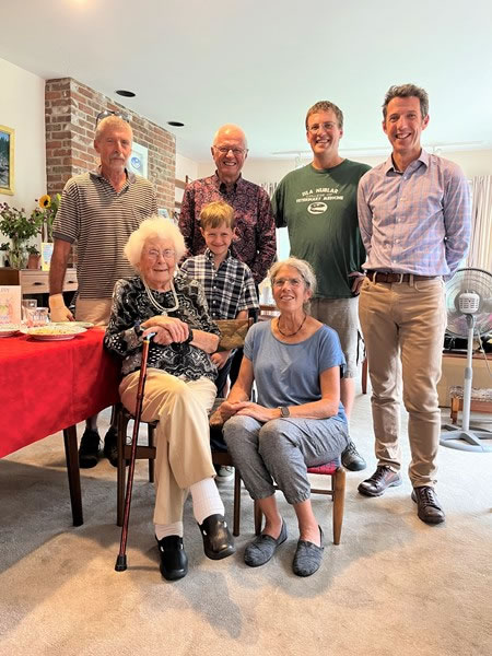 On 11 September 2022, my mother’s youngest sister Gladys Selverstone (widely known as Bobbie) turned 100. It was wonderful to be able to celebrate her birthday with her in Damariscotta, Maine. In the front in this photograph taken on the big day itself are Bobbie, Simon (Bobbie’s great great nephew), and Jane Selverstone (Bobbie’s daughter). In the back row are Andrew Selverstone (Bobbie’s oldest child and elder son), me (Bobbie’s nephew), Ben Gutzler (Jane’s son and Bobbie’s grandson), and Evan (Bobbie’s great nephew). Sadly, Bobbie – the last remaining member of my family in the generation above me – died early in 2023. |