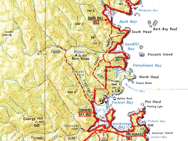 On Monday, 17 January 1983, we left Anchorage at 8:30 am and crossed the tidal flats to Torrent Bay. After breakfasting at Torrent Bay, we resumed walking and hiked via Falls River (where we had lunch) to Bark Bay.