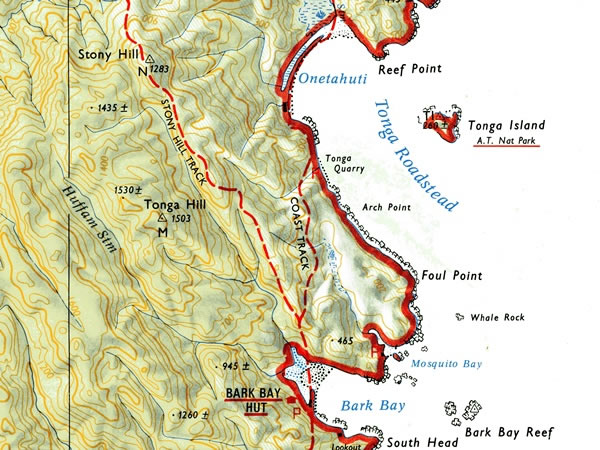 On Wednesday, 19 January 1983, we left Bark Bay at 10:10 am. Ten minutes later, we’d crossed the bay’s tidal flats, and we then headed north on the Coast Track to Tonga Quarry.