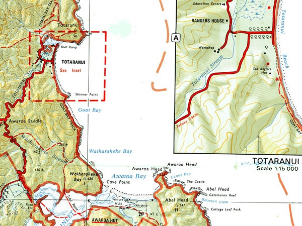 On Friday, 21 January 1983, we left the Awaroa Hut at 9:15 am, crossed the Awaroa Inlet at low tide, and then made our way via Waiharakeke Bay and Goat Bay (where we stopped for a swim) to Totaranui.