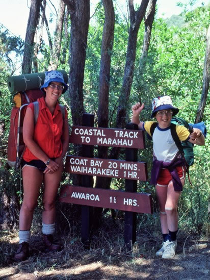 Heather and Evan looking justifiably pleased with their efforts when we finished our six-day Abel Tasman Coast Track walk at 1:00 pm. Including the break we took to have a swim at Goat Bay, we spent three-and-three-quarters of an hour hiking our final 7.1 kilometres / 4.4 miles on the Abel Tasman Coast Track walk. |