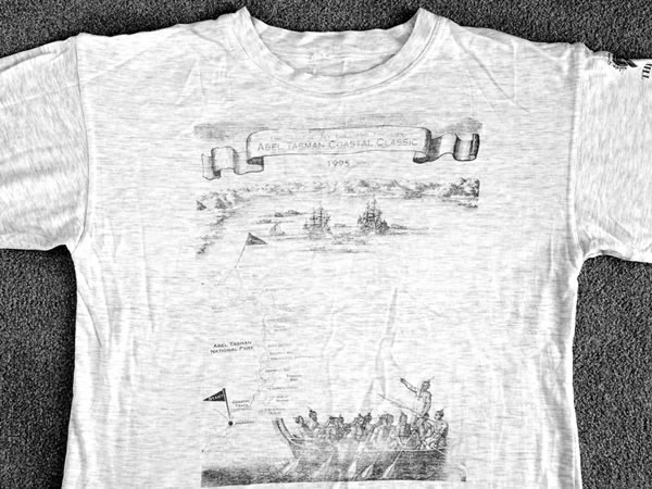 On Saturday, 23 September 1995, I ran the Abel Tasman Coastal Classic race from Marahau to Totaranui. This is a black-and-white photograph of the race sweatshirt that I still own and occasionally wear. The pictures on the sweatshirt are based on an 18th-century engraving by Frederik Ottens depicting Abel Tasman’s December 1642 arrival in Golden Bay. |